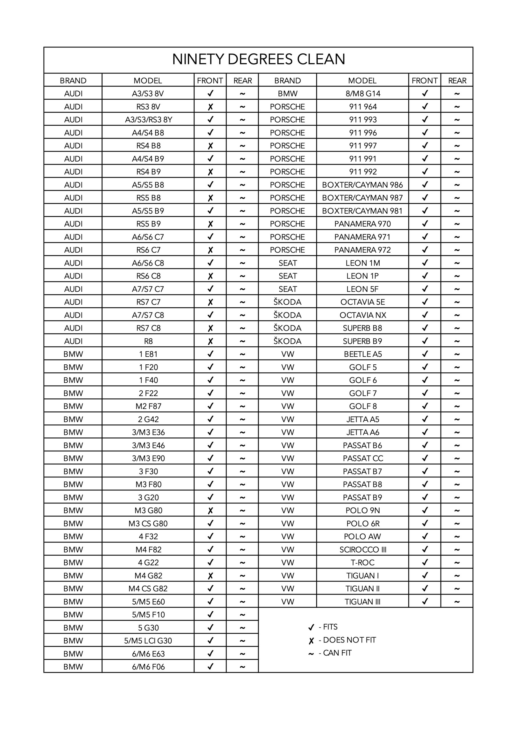 Ninety Degrees CLEAN je univerzalen nosilec za registrske tablice. Popolnoma je neviden in vaši registrski tablici daje bolj urejen in brezhiben videz, kot si ga vaše vozilo zasluži. Posebnost nosilca je montaža brez vrtanja lukenj v odbijače ali maske na vozilu, s čimer na vašemu vozilu ostane zgolj čista površina (clean look). Primeren je za registrske tablice iz različnih materialov (kovina, plastika). Praktičen je za vsakodnevno uporabo, saj svojo registrsko tablico lahko namestite in odstranite v le nekaj sekundah. Ob odstranitvi tablice na vozilu ostane samo čista površina brez vidnih znakov nosilcev, kar vašemu vozilu daje eleganten in nepozaben videz. Montaža poteka v obliki 4-točkovne pritrditve na sprednjo ali zadnjo stran vašega vozila (z notranje strani odbijača, maske ipd.). Nosilec deluje s pomočjo močnih magnetov, ki učinkovito in zanesljivo pritrdijo vašo registrsko tablico. Uporaba kakovostnih materialov in natančna izdelava zagotavljata varno pričvrstitev vaše registrske tablice. Ninety Degrees CLEAN je odporen na vse vremenske vplive in testiran do hitrosti 300 km/h.